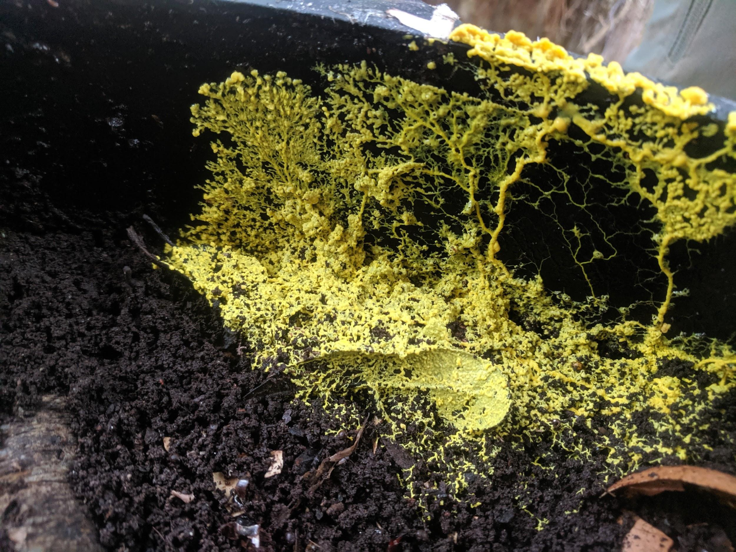 It's gorgeous in color but has a horrible name. Yellow slime mold that isn't. Yellow mold is often referred as slime mold, because the colony looks like bright slime when seen at a glance. Seems to have formed damn near overnight. Slime mold or slime mould is an informal name given to several kinds of unrelated eukaryotic organisms that can live freely as single cells.